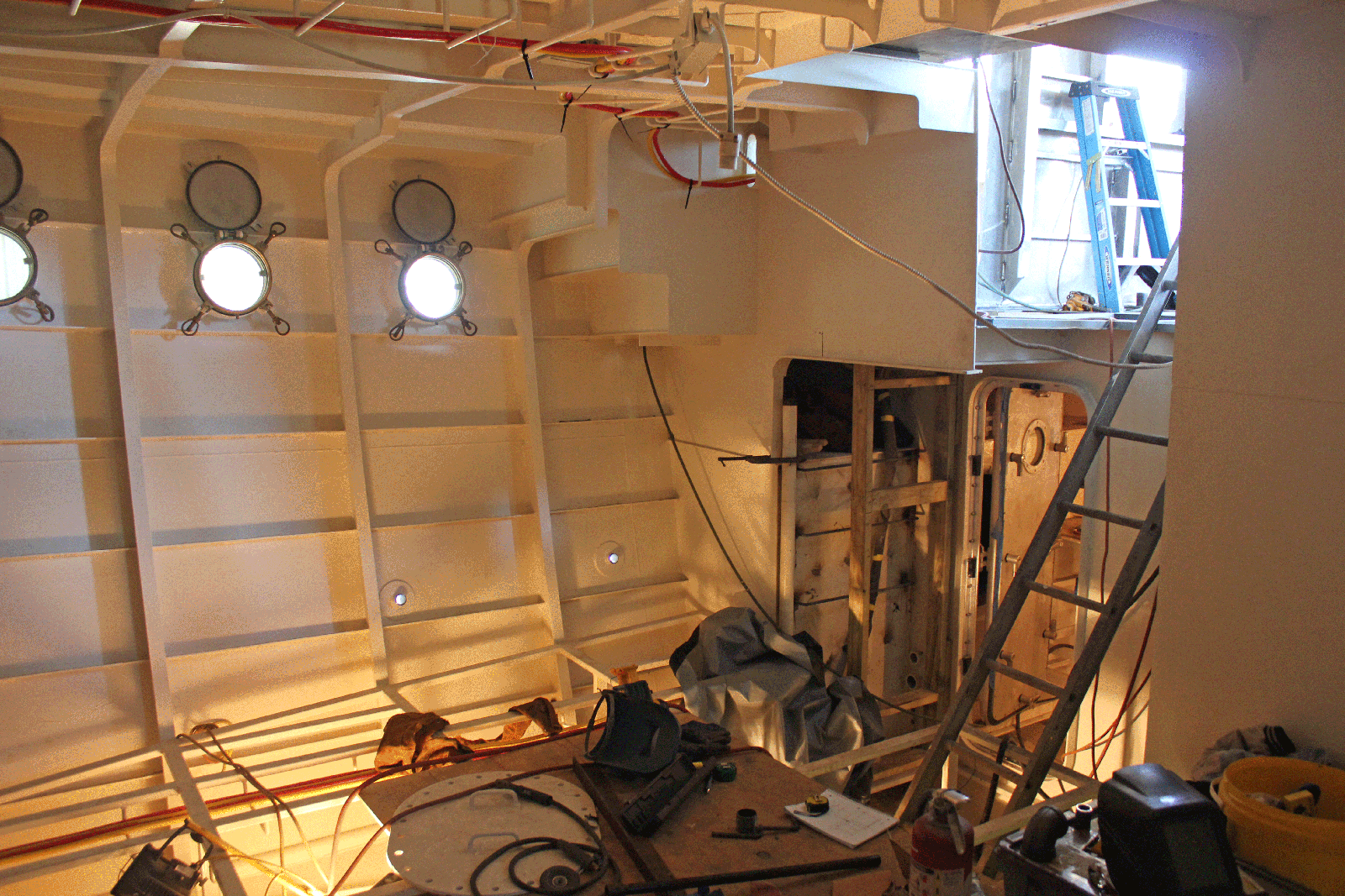 After the hull was painted it was moved back into the shop. This shot shows the bilge keels and centerline keel that all support the hull upright if we want to careen Congrio. Note also the propeller nozzle.