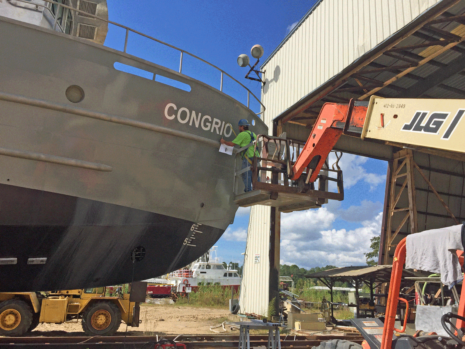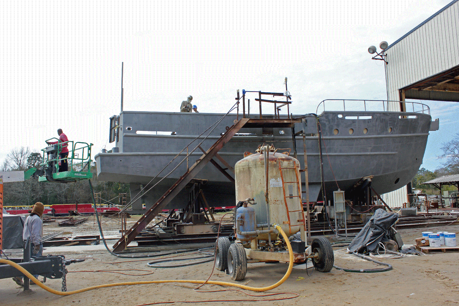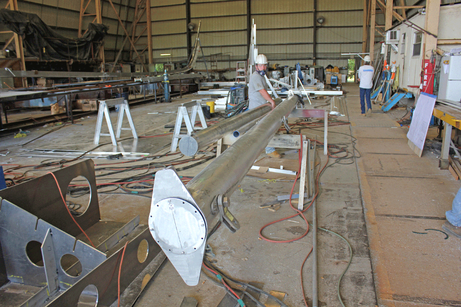 Mast and boom were fabricated in the shop. To the left is the keel of the next ship under construction.